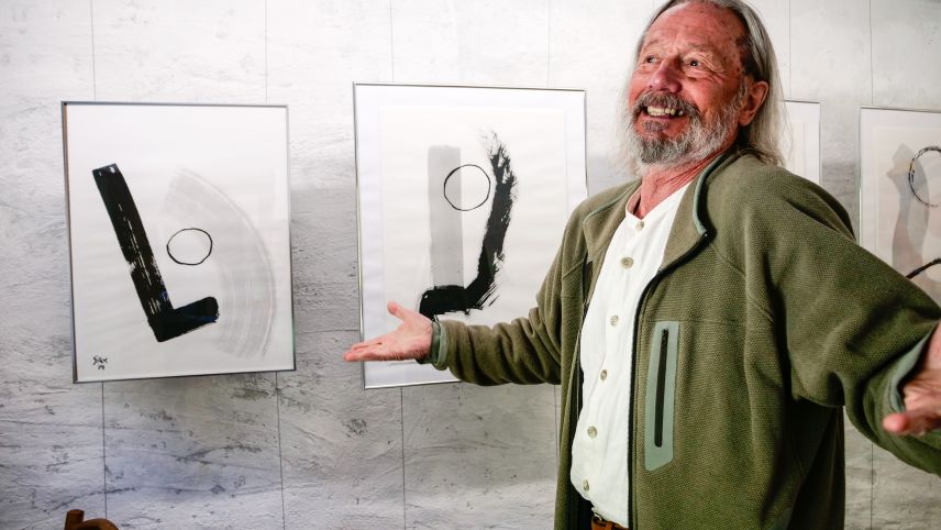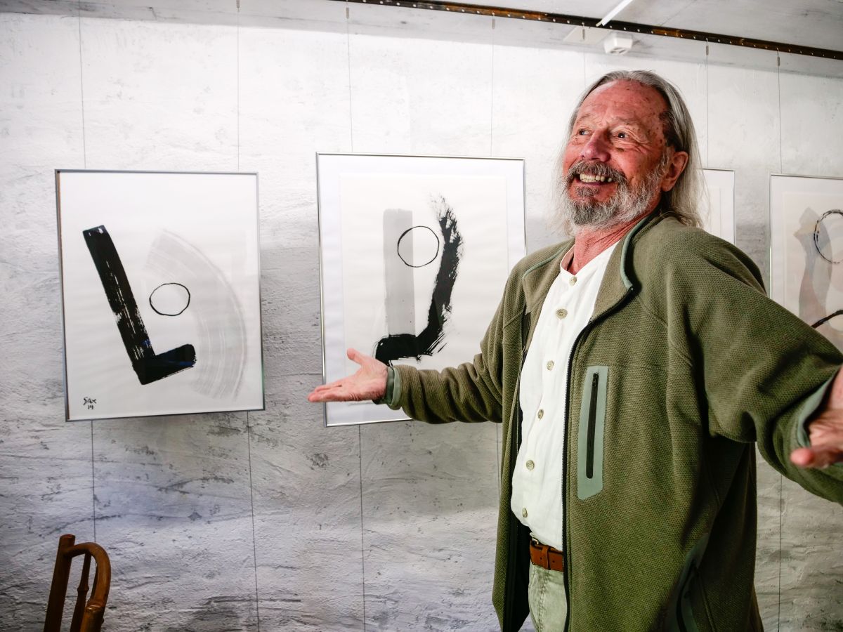 Herbert SAX Baerlocher mit den Japantuschen «Contrastante» 2014 und «Partage» 2015. Foto: Jon Duschletta