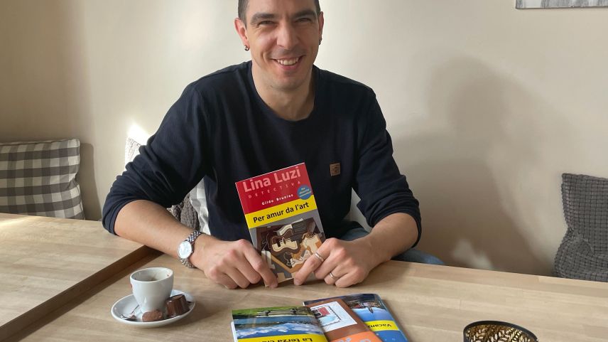 L’autur e maschinist da locomotivas Gildo Brunies cun sieus raquints criminels (fotografia: mad).