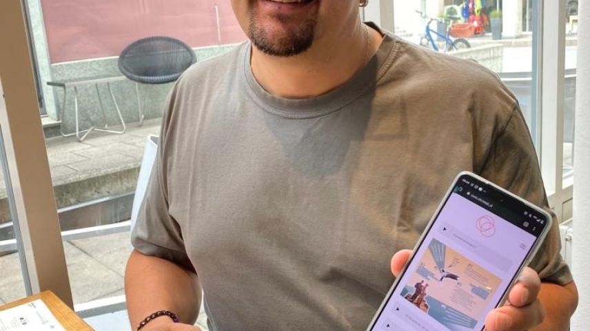 Linard Martinelli, il promotur regiunal da la Lia Rumantscha, muossa ingio chi’s riva grazcha al nouv leporello multimedial (fotografia: Flurin Andry).