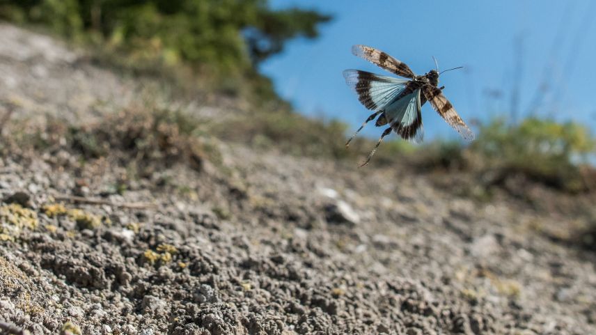 «Das diesjährige Tier des Jahres ist voller Gegensätze», bestätigt Florin Rutschmann, Heuschreckenspezialist und Schutzgebietsbeauftragter bei Pro Natura Aargau. Wie der Name verrät, bevorzugt die Blauflügelige Ödlandschrecke karges Terrain. Sie besiedelt lückige Trockenwiesen, Kiesbänke mit spärlicher Vegetation in Auen oder leicht verwilderte Bahn- und Gewerbeareale. Solche Lebensräume findet sie in der Schweiz vor allem im Wallis und Tessin, aber auch zerstreut in der Nordschweiz, teilweise mitten in der Stadt. In Südbünden ist sie im Unterengadin, im Münstertal und im Puschlav anzutreffen. «Unter den Insekten gilt die Blauflügelige Ödlandschrecke als Zeigerart. Das heisst, wo sie lebt, ist die Biodiversität hoch und es gibt noch viele andere Arten», erklärt Rutschmann.