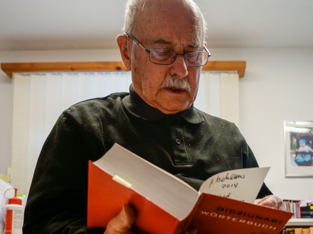 Il teolog e romanist Gion Tscharner sföglia in «seis» dicziunari puter–tudais-ch, al qual el s’ha dedichà ils ultims trais decennis (fotografia: Jon Duschletta).