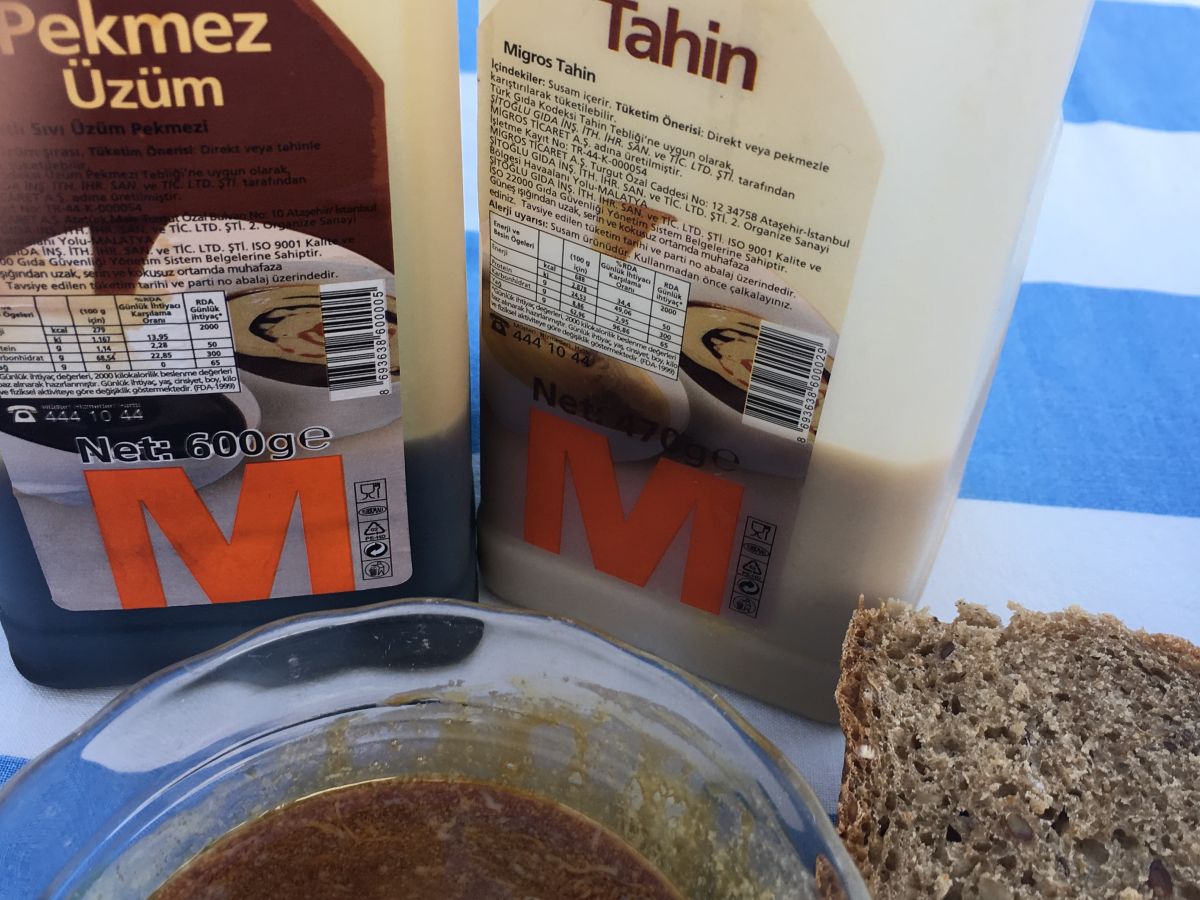 Kreativität ist aber auch hier gefragt, wenn ich Lebensmittel möchte, die es hier eigentlich nicht gibt. Kalbsfleisch, Tofu, Quark, Dinkelmehl für meinen Zopf oder Sauerrahm, um zum Beispiel einen Lebkuchen zu backen. Der Rahm sollte so richtig sauer sein, heisst es in meinem alten Rezept aus dem Luzerner Hinterland. Und Birnenhonig ist auch nötig, 500 g. Verschiedene Fehlkäufe und -Versuche später habe ich entdeckt, dass ein Dicksaft aus Trauben, den die Türken mit Tahine mischen und sich zum Frühstück aufs Brot schmieren, den Birnenhonig gut ersetzt. Ein derart exzellenter Lückenbüsser – finden meine Schweizer Freunde und Verwandte, dass ich inzwischen um die Weihnachtszeit herum regelmässig Pekmez, diesen Traubendicksaft, in die Schweiz exportiere.