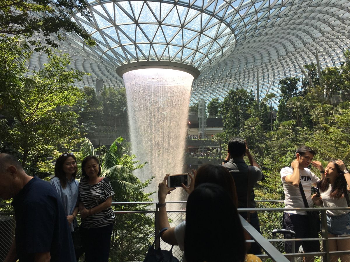 Wer nicht weiss, was los ist, glaubt sich auf einem Filmset. Unter einer gigantischen Plastikhaube, einer Raumstation eines Science Fiction Streifens nicht unähnlich, stürzt mitten auf dem Flughafengelände eine 43 Meter lange Wassersäule nieder. Rundherum ein dichter Wildwuchs aus Palmen, Gummibäumen und sonstigem Gesträuch. Die Shuttlezüge, die die Flughafen-Terminals miteinander verbinden, fahren mitten durch dieses Wunderland. Völlig unerwartet und verwundert staunte ich kürzlich – im Transit von Australien nach Indien - aus dem Zugsfenster und vergass in der Verwunderung, meinen Koffer festzuhalten. Doch: Was zunächst verwirrlich anmutete, entpuppt sich als perfekter PR-Trick. Natürlich will auch ich genauer sehen, was ich aus dem Shuttle nur erhaschen konnte: Den Welt höchsten Indoor-Wasserfall plus Dschungelpflanzen mit Lichtshow und – typisch Singapur - gigantischem Shopping Center. Die Singapuri nennen das alles «Jewel».