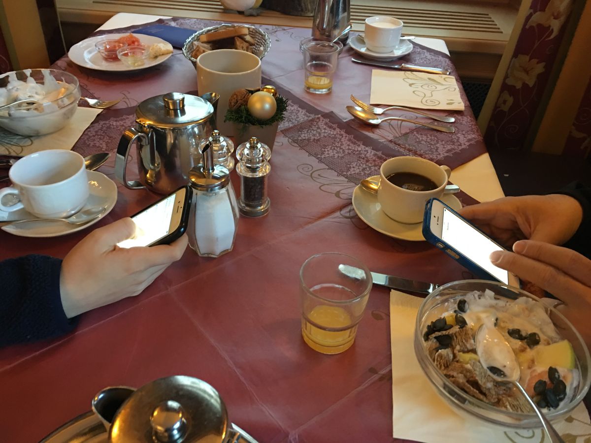 Nachdenklich stimmt mich, wenn ich im Restaurant sitze und rund um mich herum an jedem Tisch dutzende Handys gezückt sind. Kürzlich sass ich gegenüber einer lieblich gedeckten Tafel mit Kerzen, Herzen, zwei weissen Schwänen. Offensichtlich ein Tisch für ein spezielles Tete-a-Tete. Doch statt sich verliebt in die Augen zu blinzeln, starrten beide auf ihre Screens, tippten, scrollten - jedeR für sich.