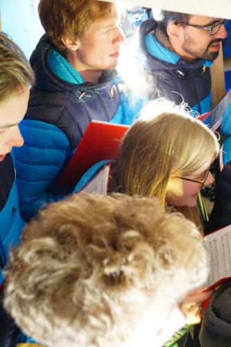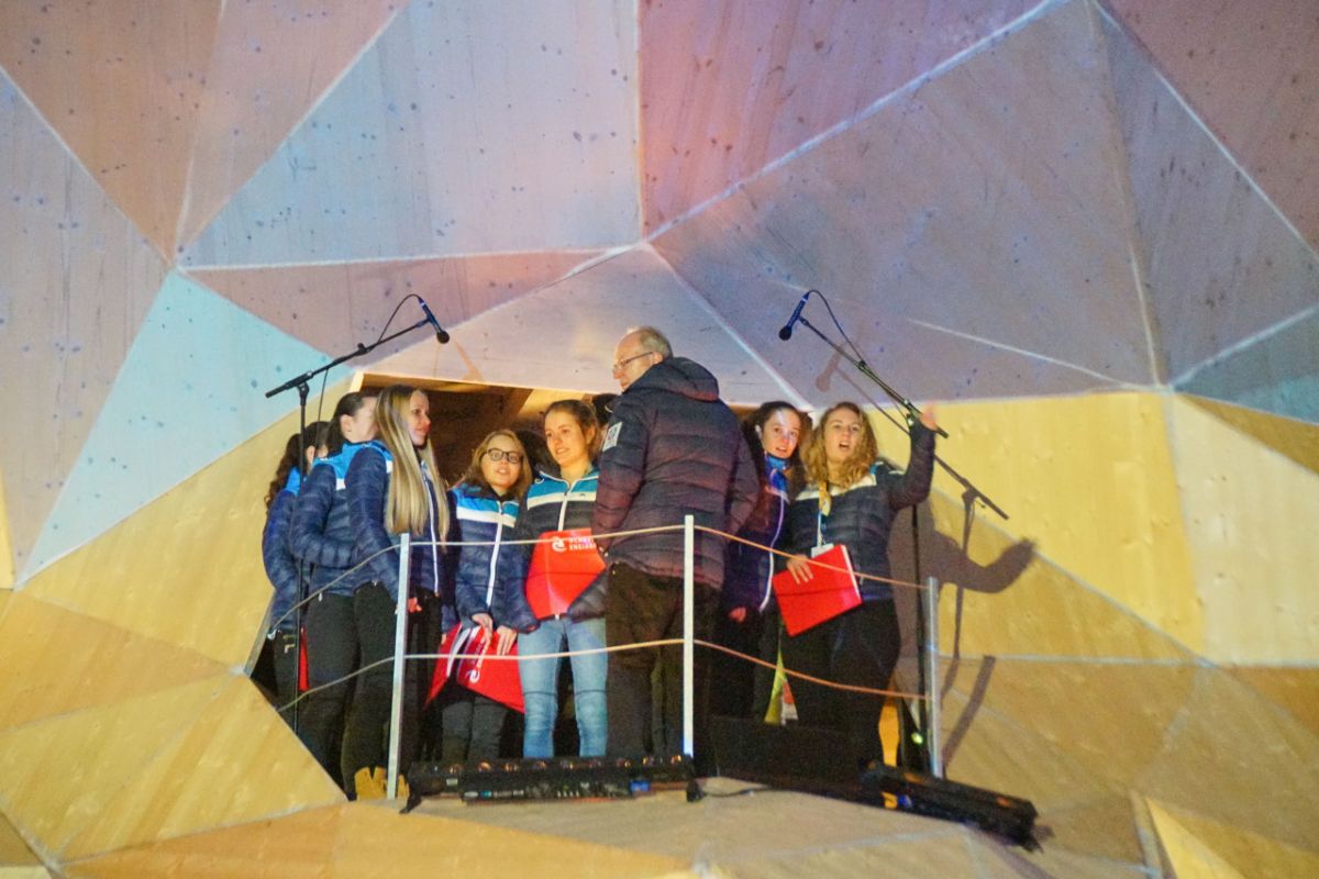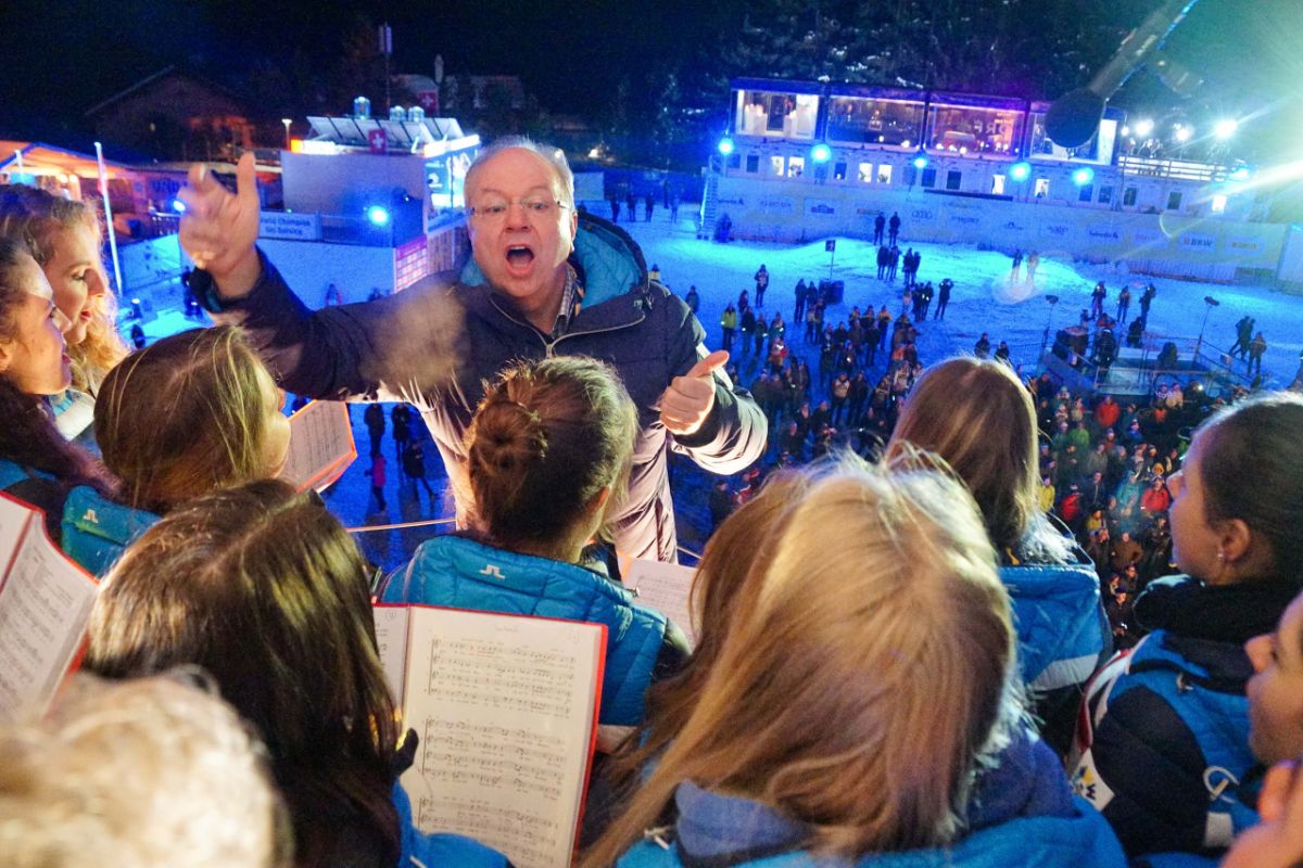 Che onur! E che chatschöz! 20 scolaras e scolars da l'Academia Engiadina da Samedan as squitschan illa luocha dal skiunz da lain «Edy» e stumplan bod sur la spuonda giò a lur dirigent e promotur Werner Steidle. Sur ils amplifichaduors fo Knackeboul atmosfera i'l parc dal Kulm a San Murezzan e pissera per buna glüna. Quella haun surtuot ils fans da la squedra francesa chi ho guadagno zievamezdi l'occurrenza da las squedras. Ot sü sur il plazzel da festa ed ot sur il palc dals champiunedis mundiels da skis regna ün'atmosfera agiteda. Steidle quieta, fo curaschi e tira adimmaint duos passaschas pü difficilas da la chanzun ch'els chantaron in pochs minuts. El as sfruscha ils mauns cunter il fraid.