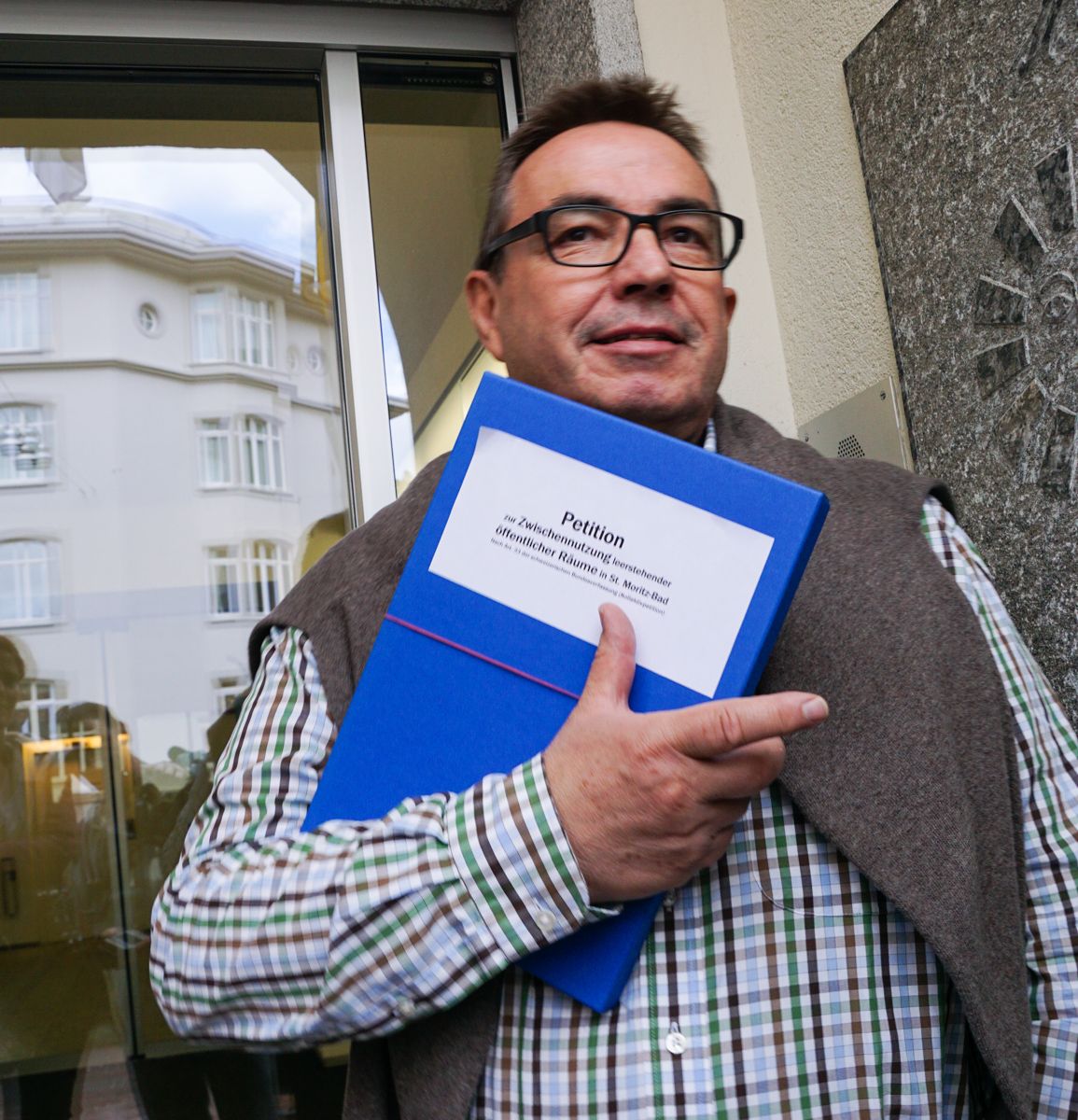 Der St. Moritzer Gemeindepräsident Sigi Asprion hat am Dienstag die Unterschriftenbögen entgegengenommen. Foto: Jon Duschletta