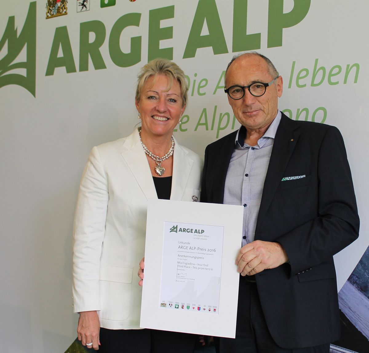 Regierungsrätin Barbara Janom Steiner gratuliert Arge-Alp-Preisträger Not Carl vom Projekt «Mia Engiadina» (Foto: Arge Alp).