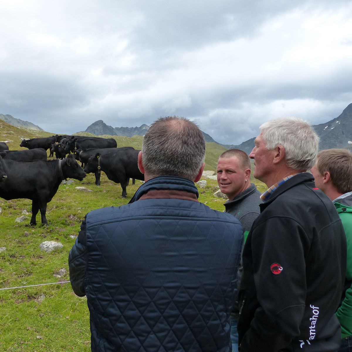 Discussiun traunter differents purs chi contaimplan il muvel da la razza angus süll’Alp Muottas (fotografia: Flurin Andry).