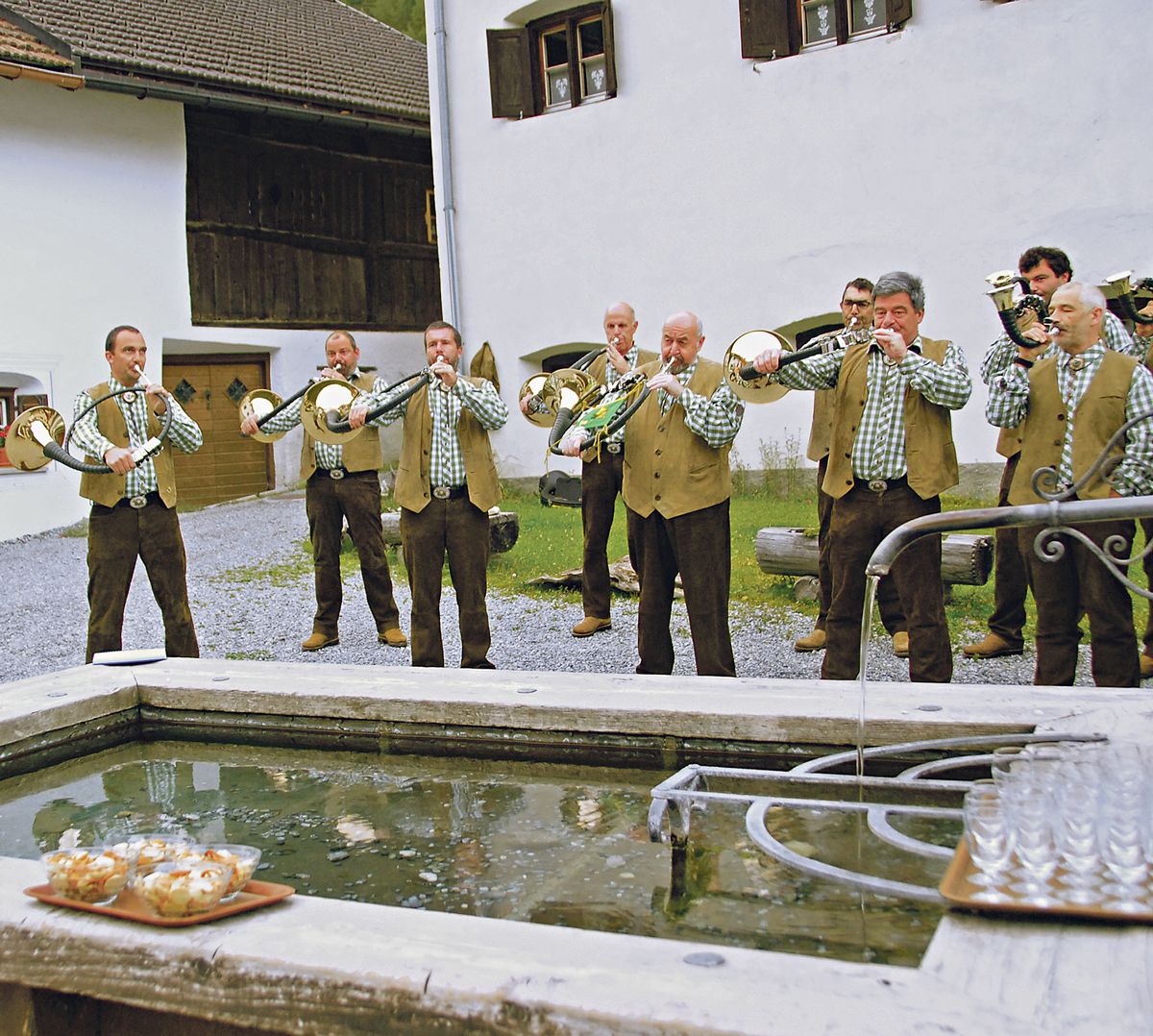 Die Jagdhornbläsergruppe von Scuol bläst auf dem Dorfplatz in S-charl zum Jagdbeginn ein. Foto: Selina Bisaz