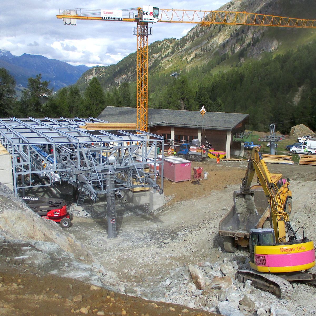 Auf der Alp Surlej stehen Lastwagen, Bagger und sogar ein Kran. Grund dafür ist die Grossbaustelle der neuen Curtinella Sechser Sesselbahn. Diese wird neben der Talstation der Surlej Sesselbahn stehen und die Skifahrer zu den Pisten von Furtschellas bringen.