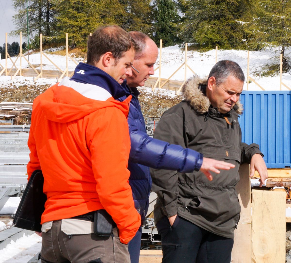Guido Mittner (Mitte) während einer Bauabnahme im Zielgelände der Ski-WM 2017 in St. Moritz. Foto: Jon Duschletta