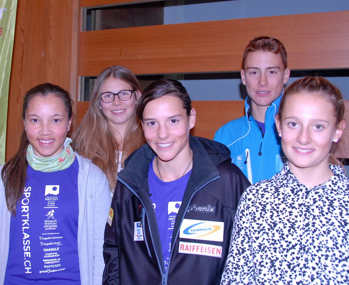 Der Alpin-Nachwuchs freut sich auf die WM in St. Moritz. Von links: Jenny Merz, Domenica Mosca, Laura Lindegger, Florian Rechsteiner und Mirja Malgiaritta (Foto: Nicolo Bass).