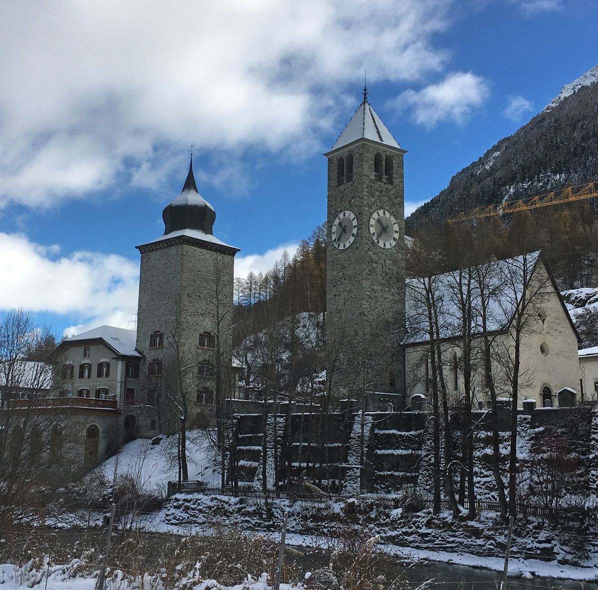 Insembel culla Tuor Planta (a schnestra) fuorma la baselgia San Jon da Susch üna tscherta unità (fotografia: Hermann Thom).