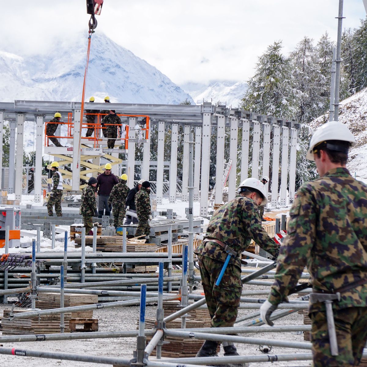 Die Schweizer Armee (im Bild während den Tribünenaufbauten im Oktober) stellt der Ski-WM rund 5000 Diensttage weniger als geplant zur Verfügung. Das wiederum verursacht Mehrkosten beim Zivilschutz. Foto: Jon Duschletta