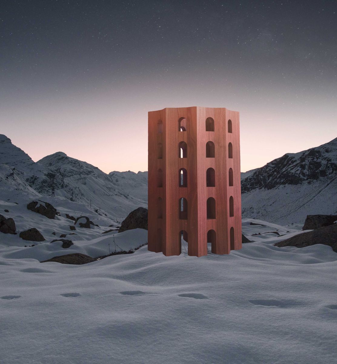 Fotomontage vom Roten Turm, dem geplanten dreissig Meter hohen Theatergebäude auf dem Julierpass. Rendering: Origen