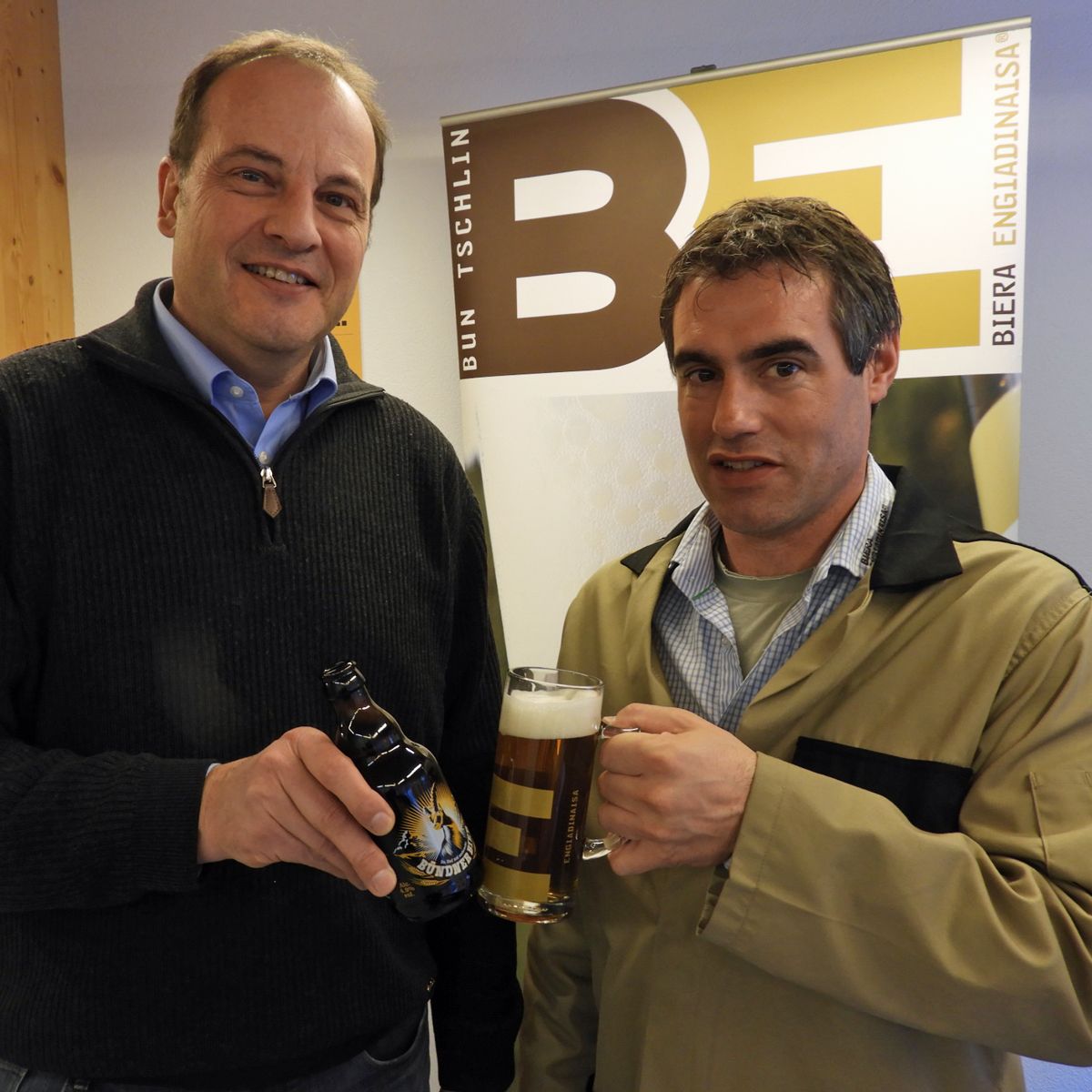 Bruno Güntensperger (a schnestra) da la «Liechtensteiner Brauhaus AG» e Reto Rauch, manader da gestiun da la Bieraria Tschlin SA, s’allegran da la nouva collavuraziun (fotografia: Annatina Filli).