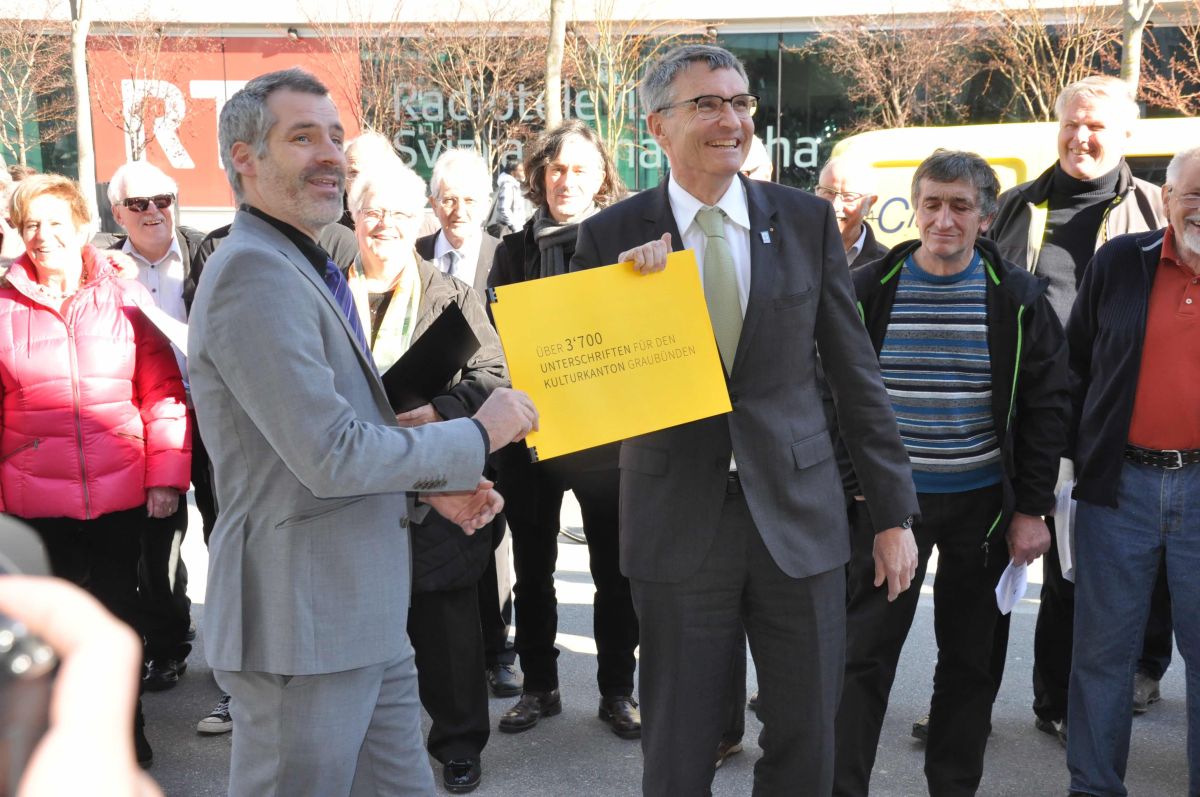 3828 Personen haben die Petition für eine bessere und ausgewogenere Kulturförderung im Kanton Graubünden unterschrieben. Vor dem Grossratsgebäude überreichte Nic Schmid seitens der Initianten Standespräsident Michael Pfäffli ein symbolisches Schild. Die Petition hatte gerade in den letzten Tagen noch einen markanten Zuspruch verzeichnet.