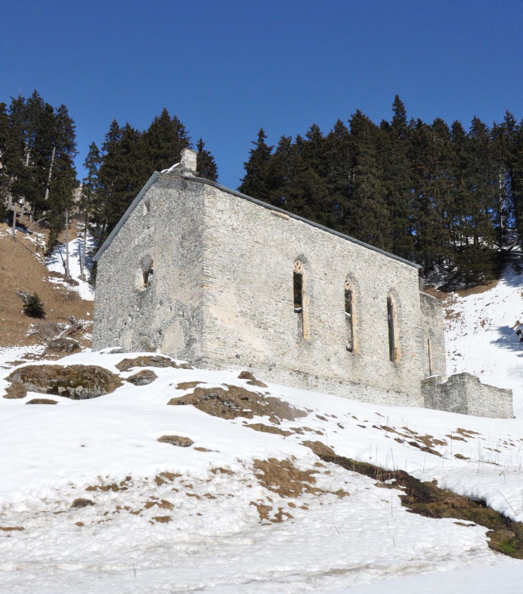 Die Kirchenruine von San Gaudenzio ob Casaccia. Das Sakralgebäude und das Hospiz sind Gegenstand einer sanften Restaurierung, die viel kostet und noch nicht abgeschlossen ist. Foto: Marie-Claire Jur