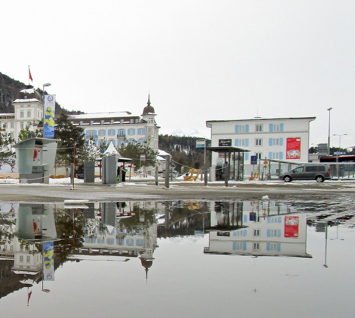 Die warmen Tage und die Schneeschmelze haben es möglich gemacht, dass sich das nicht gerade saubere Schmelzwasser auf dem am Boden noch gefrorenen Parkplatz sammelt. Und schwups gibts einen untiefen, neuen See in St. Moritz Bad: Für einige Tage liegt das Hotel Kempinski am See.