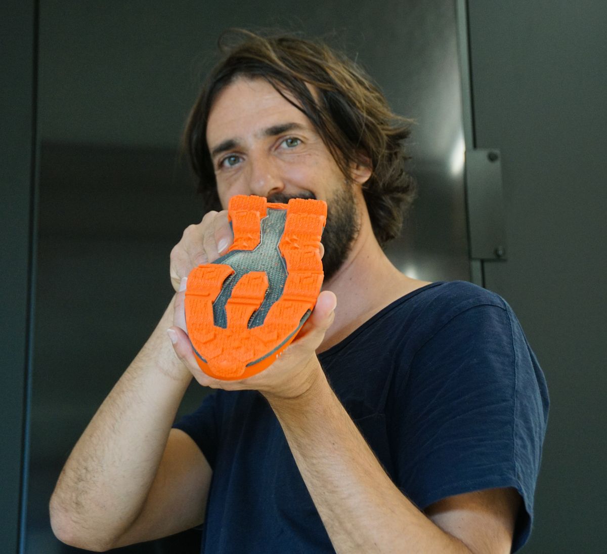 Caspar Coppetti in seinem Zürcher Hauptsitz mit einem On-Lauf- und Freizeitschuh. Dessen spezielle Sohle dämpft beim Auftreten, leistet aber Widerstand beim Abstossen. Foto: Jon Duschletta