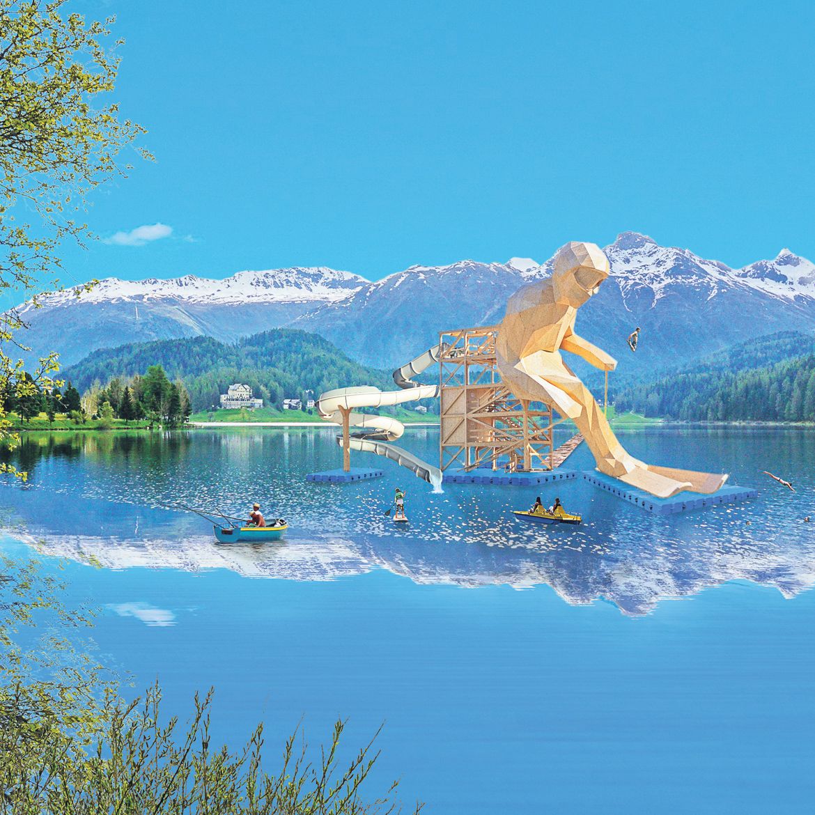 Schon im Sommer wird der St. Moritzersees zum Tummelfeld für Wasserratten und mehr. Mittendrin feiert Ski-WM-Edy ein unerwartetes Comback. Fotomontage: Lucas Kirchen