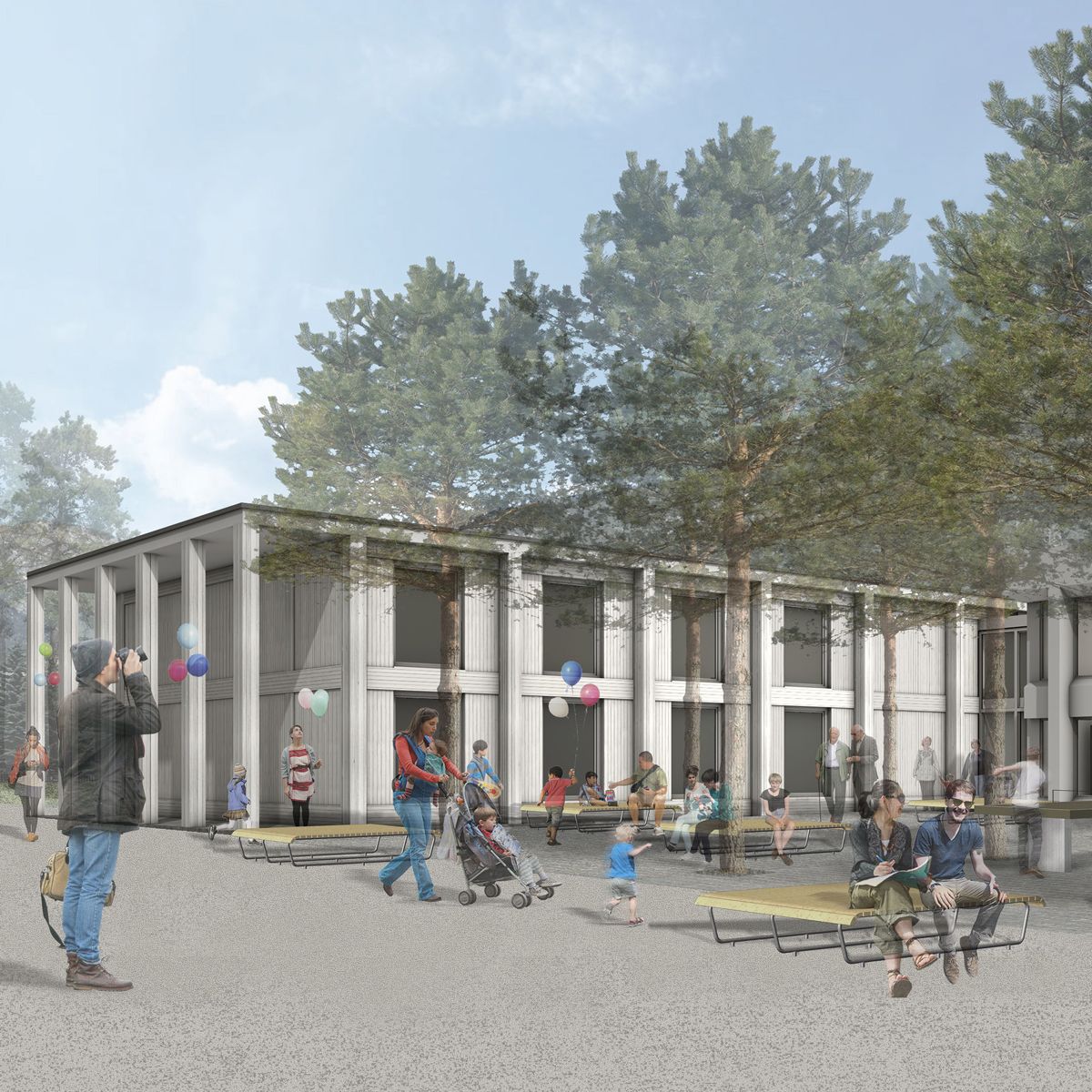 Das Schulhaus mit Pausenplatz aus Sicht des Projekts «Futura Nova». Foto: Brasser Architekten