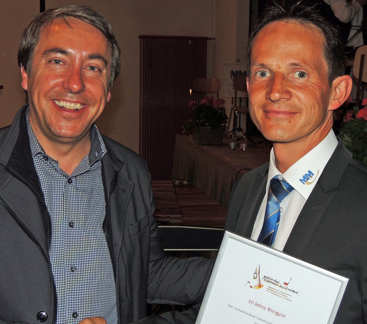 Andy Kollegger, president da l’Uniun chantunala da musica (a schnestra) ha surdat in occasiun dal concert da prümavaira ün diplom a Roberto Donchi per seis giubileum da 20 ons sco dirigent da la Musica Concordia Müstair (fotografia: Benedict Stecher)