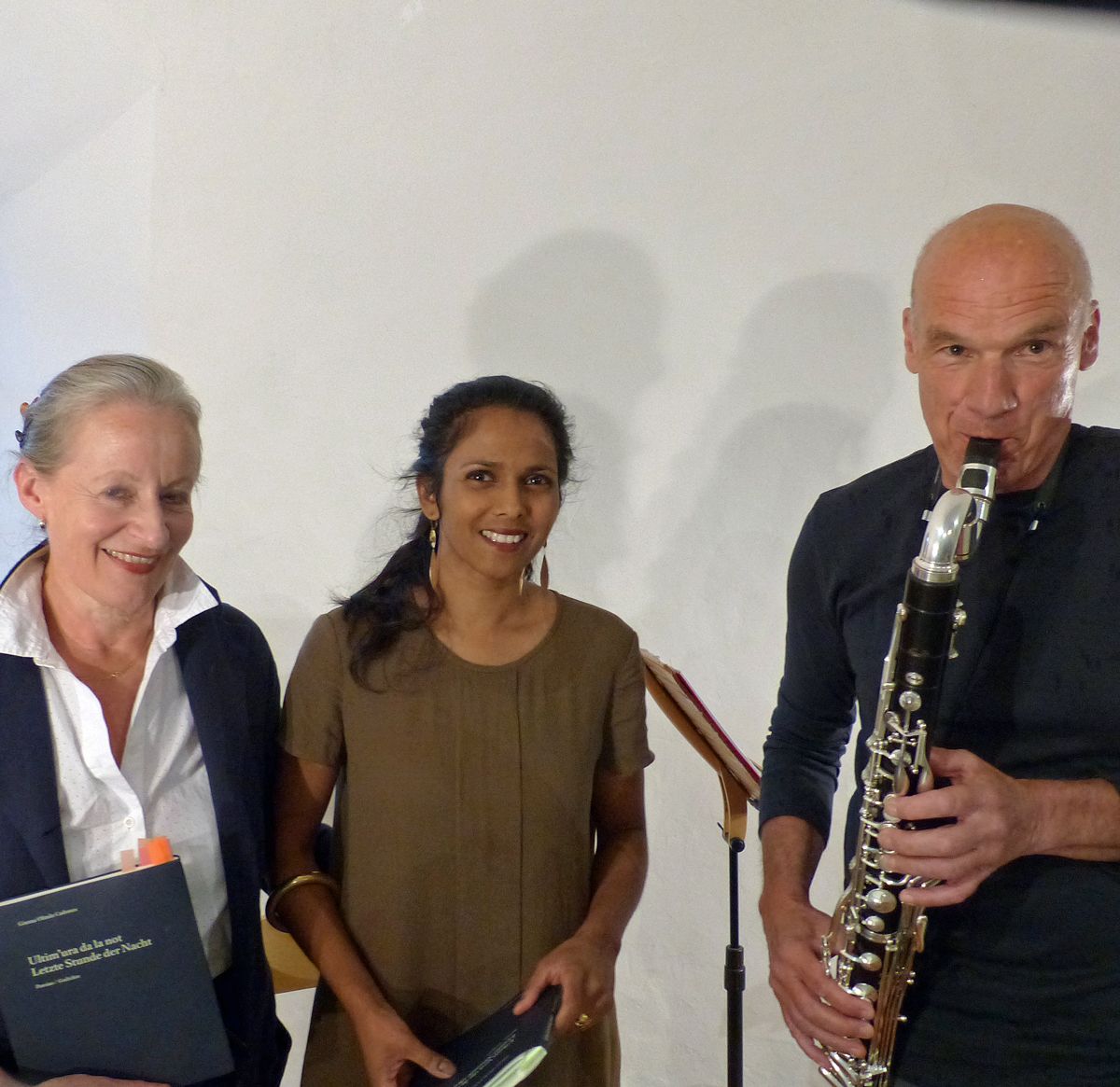 L’autura Gianna Olinda Cadonau ha discus cun l’editura Mevina Puorger (a schnestra) sur dal far uorden i’l tscharvè ed es gnüda accumpagnada dal musicist Andri Steiner (fotografia: Flurin Andry).