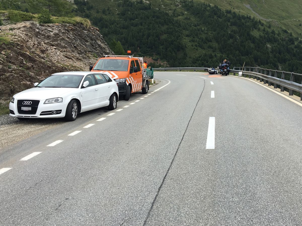 Am Montag fuhr um 13.15 Uhr ein Autofahrer vom Zollamt La Motta kommend in Richtung Bernina Hospiz. In einer Rechtskurve geriet das Auto auf der regennassen Fahrbahn über die Strassenmitte hinaus und kollidierte seitlich mit einem entgegenkommenden Motorrad. Die Sozia verletzte sich leicht.