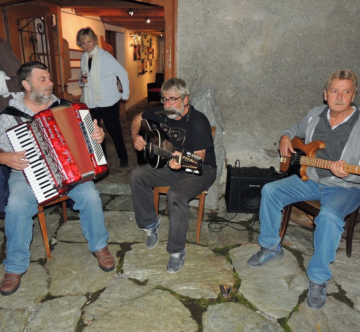 Paulin Nuotclà (culla guitarra) ha adüna darcheu plaschair cun seis amis musicants (fotografia: Benedict Stecher).