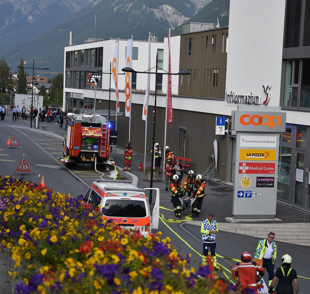 Dürant la prouva d’alarm a Scuol es il Coop gnü evacuà (fotografia: Nicolo Bass).