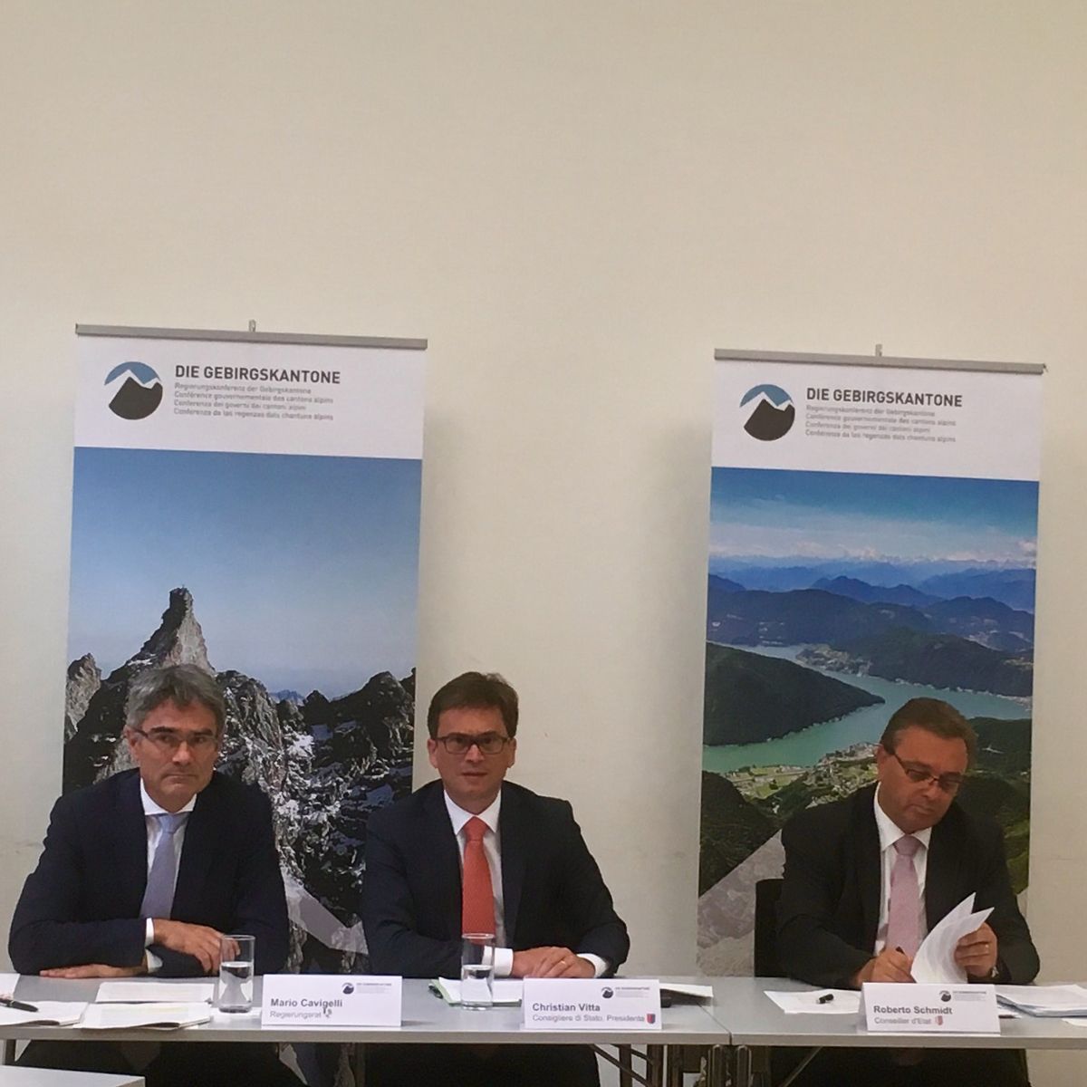 Die Regierungskonferenz der Gebirgskantone RKGK setzt sich für die Wasserzinse ein. Von links: Regierungsrat Mario Cavigelli und die beiden Staatsräte Christian Vitta (Präsident RKGK), Tessin, und Roberto Schmidt, Wallis. Foto: Jon Duschletta