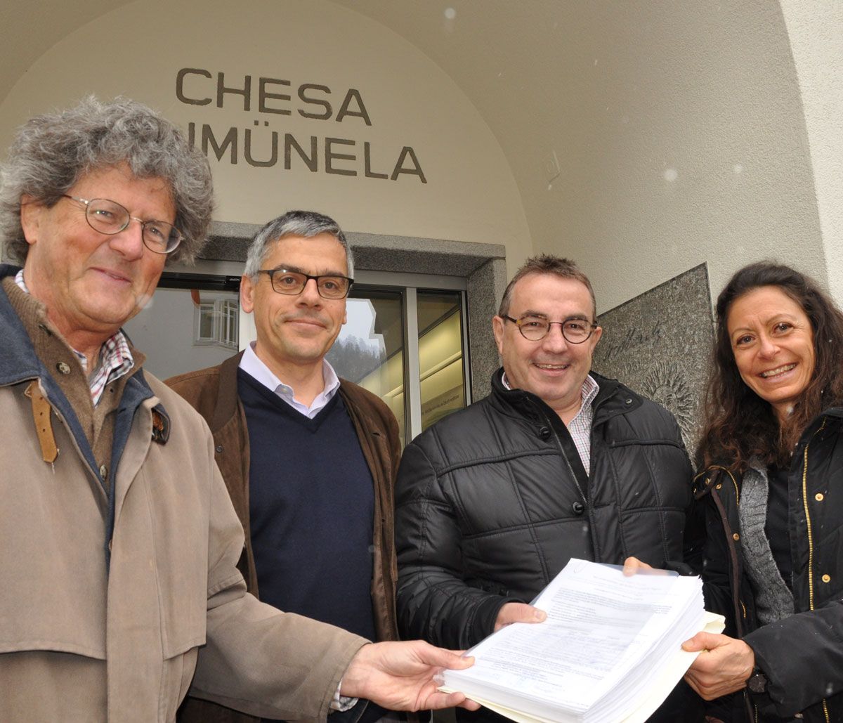 Ramon Zangger, Reto Caflisch und Mirella Carbone (von links) übergeben dem Vorsitzenden der Präsidentenkonferenz, Sigi Asprion (Zweiter von rechts) die Unterschriften.