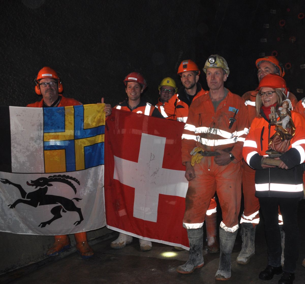 Feierlicher Moment in der Kaverne des RhB-Albulatunnels. Am 17. Oktober kurz vor Mittag erfolgte der Durchstich von Norden her und die Mineure vom Vortrieb Preda trafen auf die Mineure vom Vortrieb Spinas.