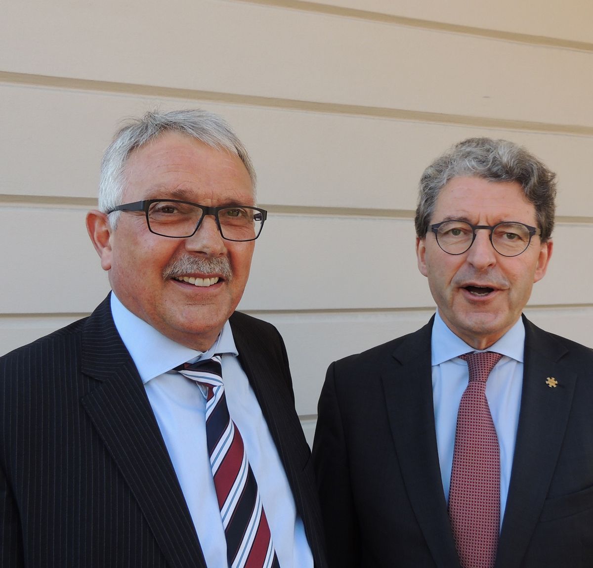 Il capo cumünal da Scuol, Christian Fanzun, ha salüdà la Cumischiun dal Cussagl naziunal cul president Heinz Brand a Scuol (fotografia: Benedict Stecher).