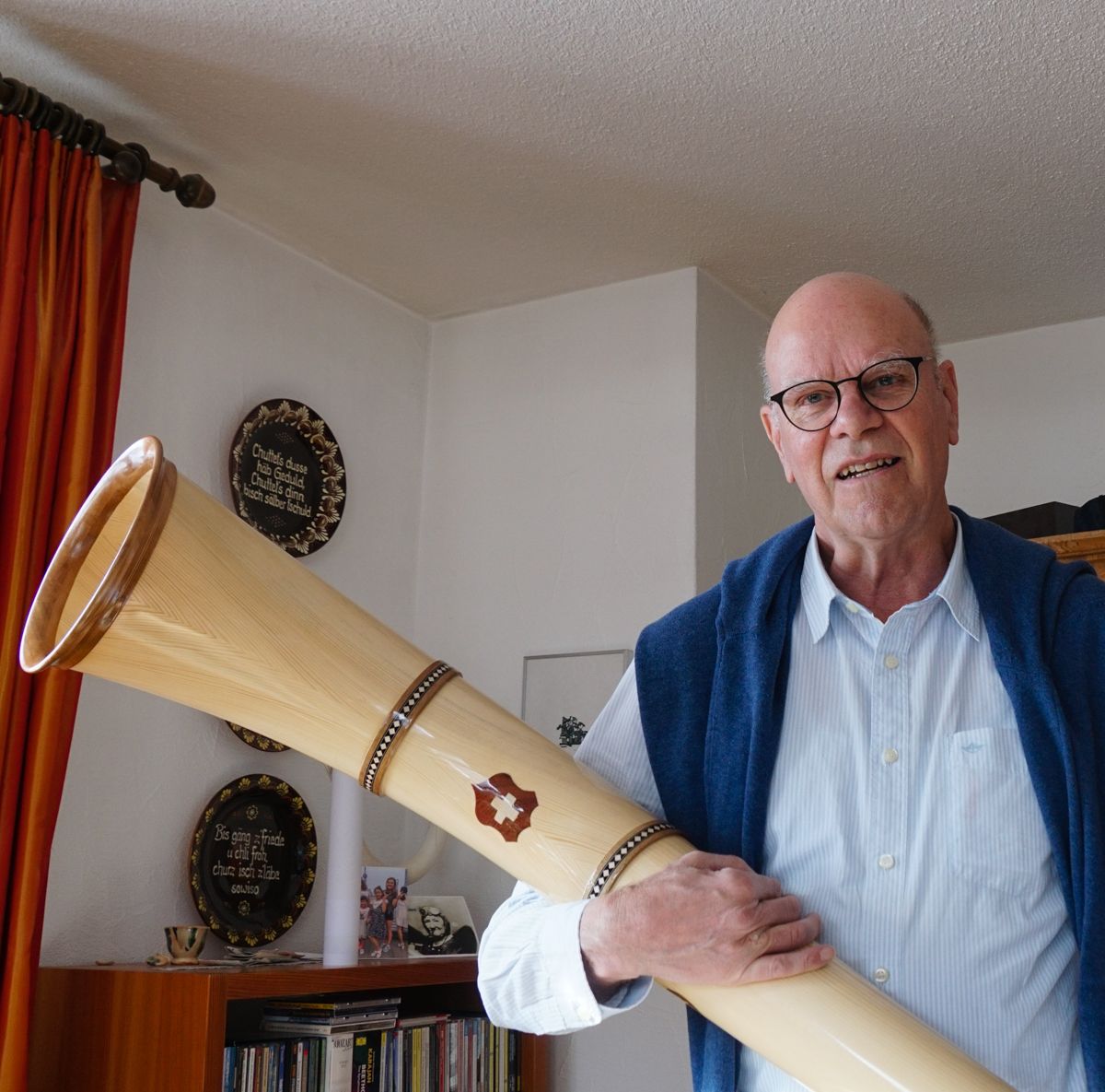 Nur mit Übung ist Hansruedi Strahm überzeugt, gelingt die Annäherung an das Hirteninstrument, das Alphorn. Fasziniert von dessen mystischen Naturtönen hat sich der pensionierte Verlagsleiter sein erstes Alphorn selbst gebaut und es spielen gelernt.