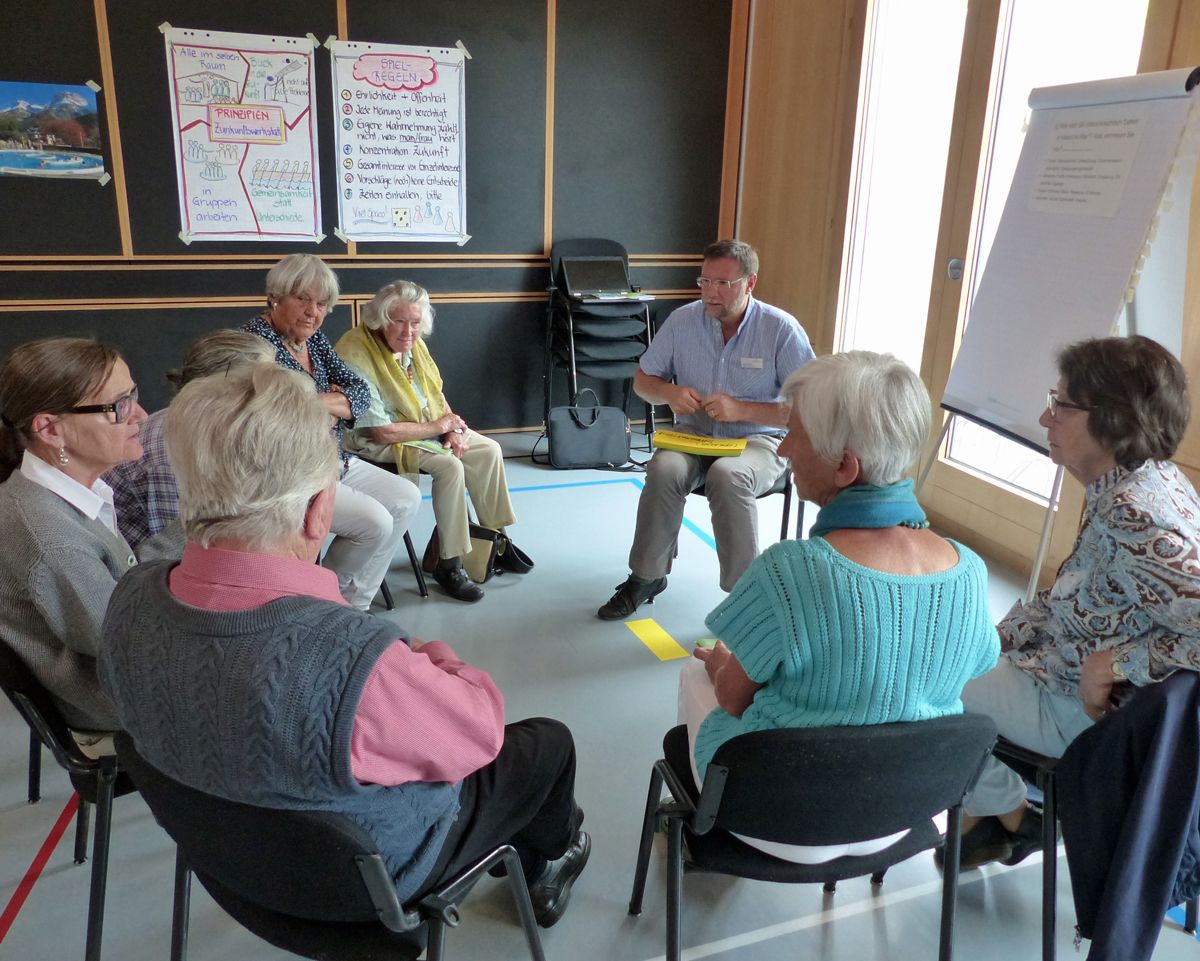 In gruppas, qua quella cun Othmar Lässer da la Pro Senectute, han ils partecipants dal lavuratori a Strada analisà la situaziun e notà ils bsögns chi existan a Valsot (fotografia: Flurin Andry).
