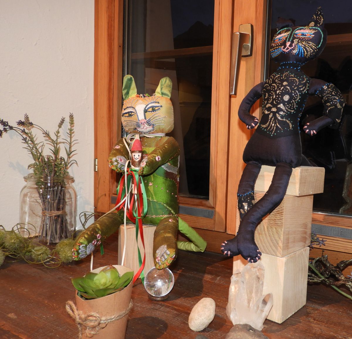 Ils giats verd e nair da l’artista Regula Schmid sun exposts illa Grotta da cultura a Sent (fotografia: Annatina Filli).