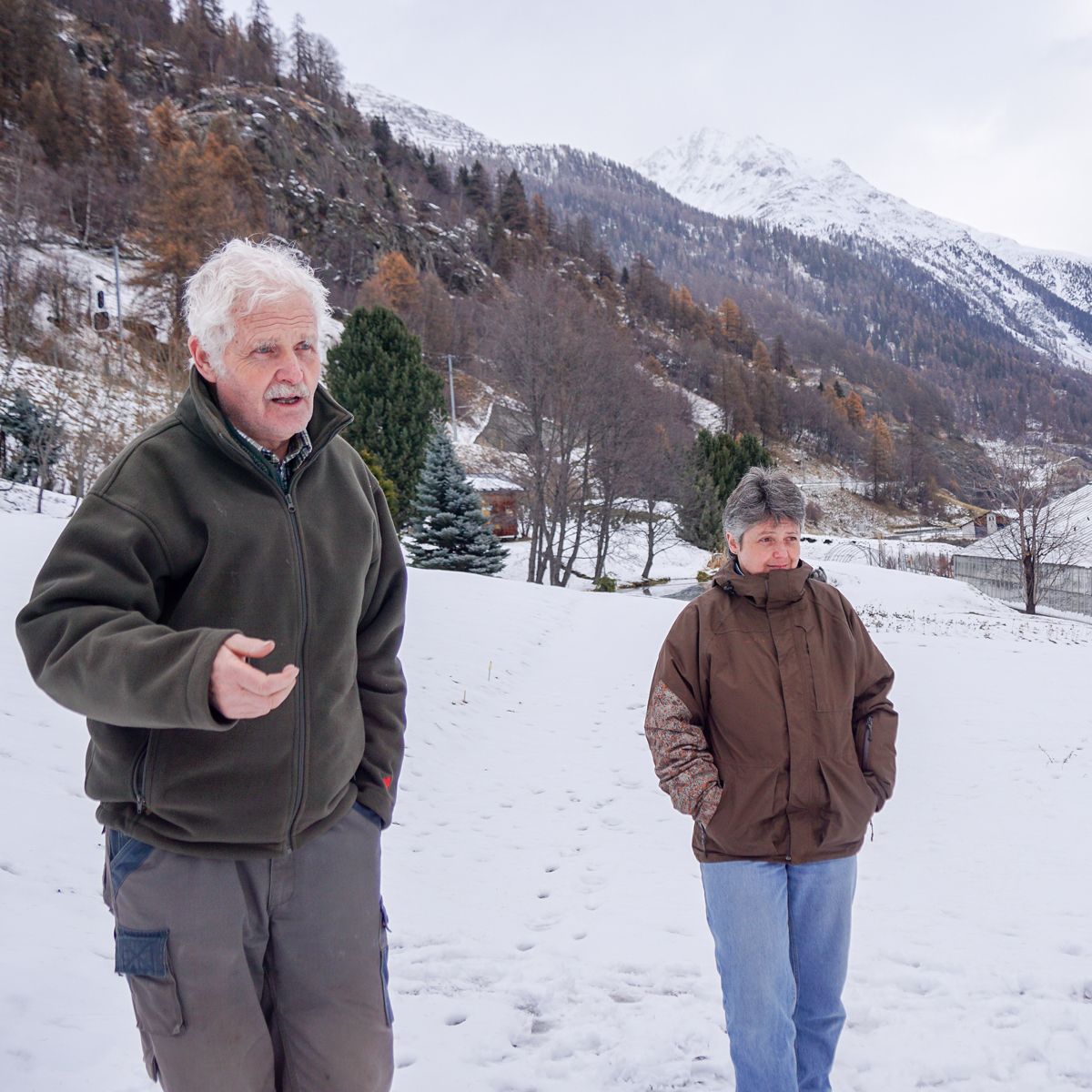 Steivan Müller und seine Tochter, Geschäftsführerin der Giardinaria Müller SA, Elisa Bonorand-Müller, stehen auf dem Landstrich, welcher durch den Bau der Umfahrung zerstört würde. Sie kämpfen nicht gegen eine Umfahrung, aber für den Erhalt ihrer Existenz