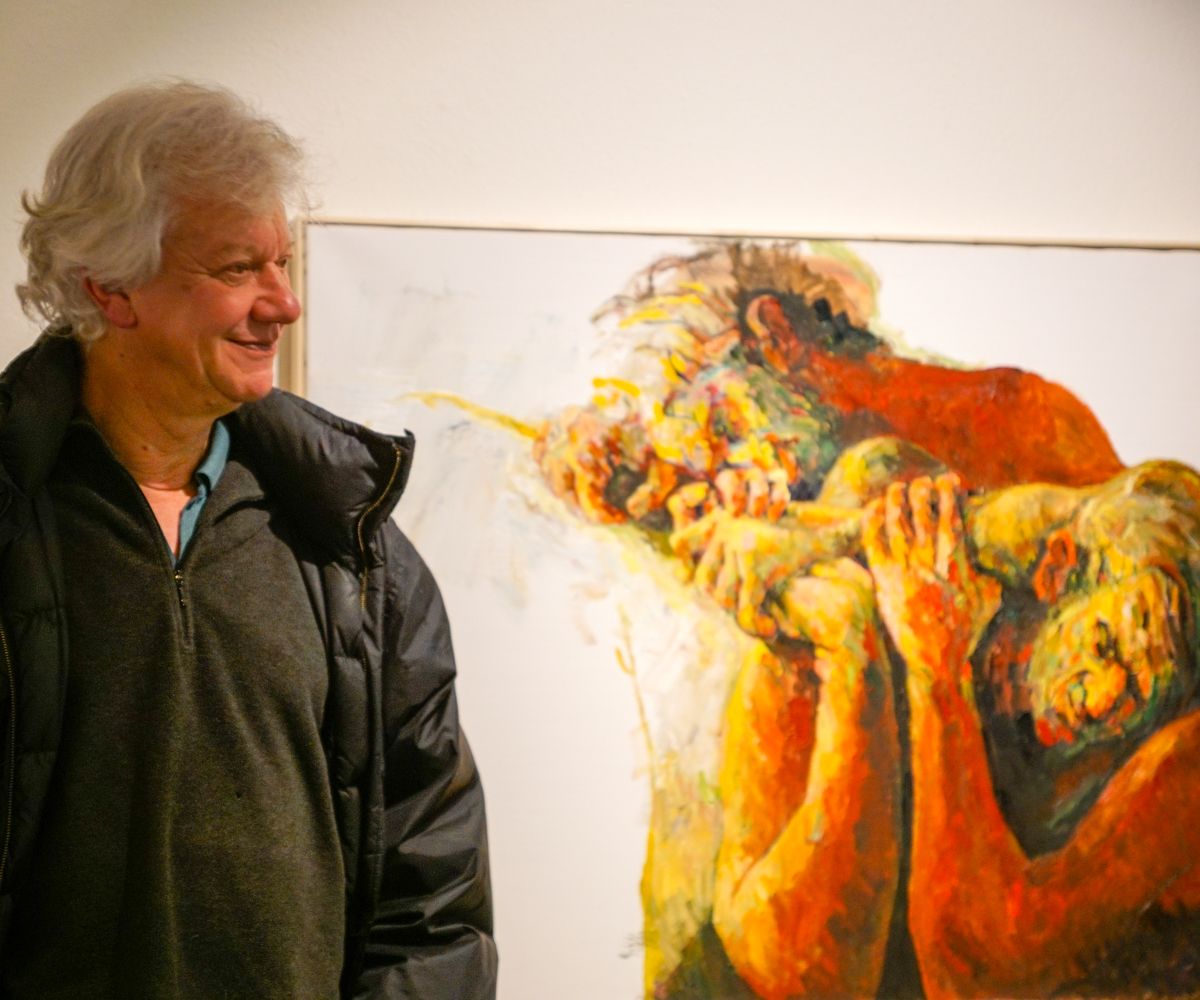 Bruno Ritter in der Galerie La Suosta vor einem Ölgemälde aus der Serie «Kampf». Foto: Jon Duschletta