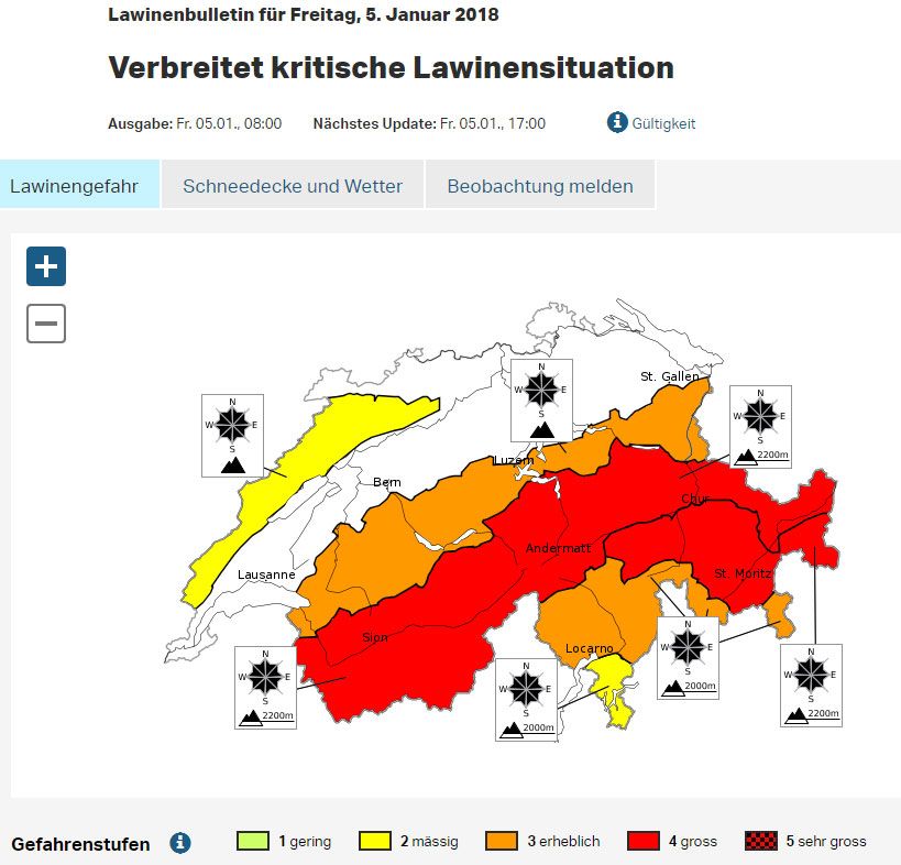Gefahrenstufe gross (Plaiv ab Zuoz, Unterengadin, Samnaun inklusive Val Müstair): Es sind weiterhin spontane Lawinen zu erwarten, vor allem in der Nacht. Es muss mit Lawinen gerechnet werden, die bis in die Täler vorstossen. Die ...