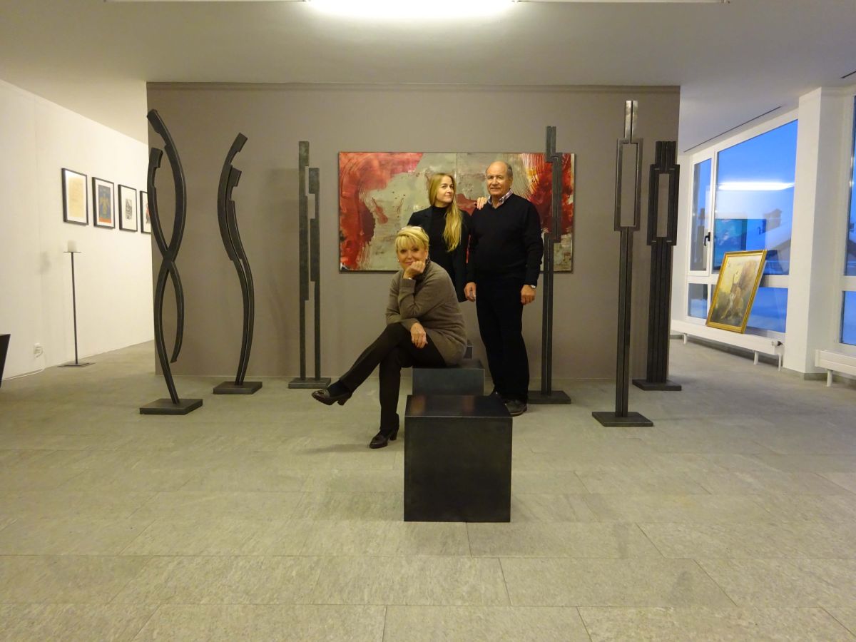 Enrico Giacometti in seiner Galerie zusammen mit seinen aktuellen Gastkünstlerinnen.