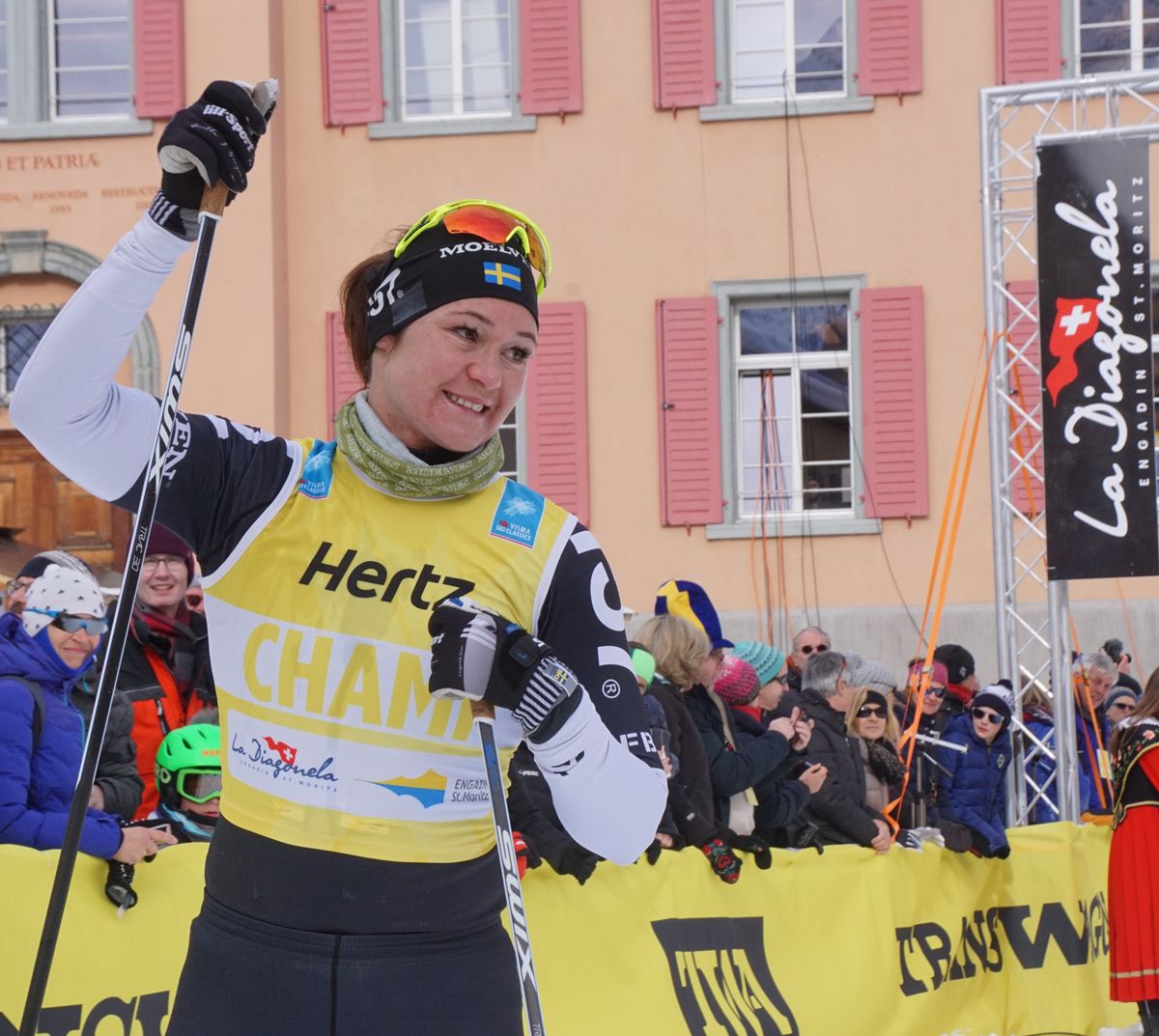 La Diagonela-Siegerin 2018 Britta Johansson Norgren nach ihrer Zielankunft in Zuoz. Fotos: Jon Duschletta
