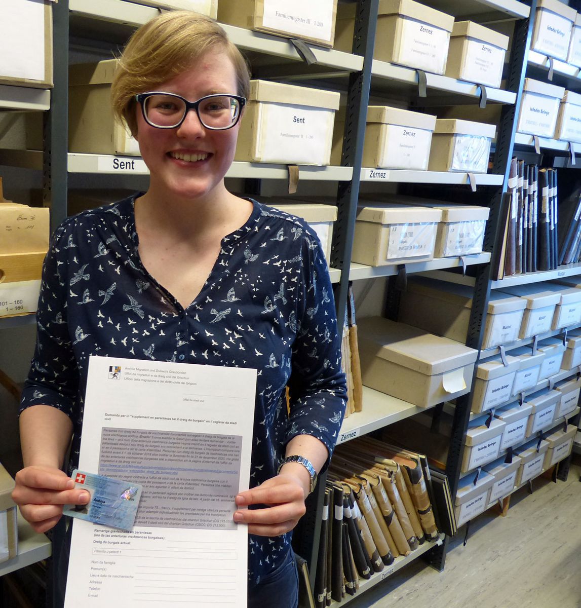 Tina Luzzi, l’uffizianta dal stadi civil Engiadina Bassa, cun carta d’identità e’l formular per far la dumonda d’indichar eir il lö da vaschinadi sün documainta ufficiala (fotografia: Flurin Andry).