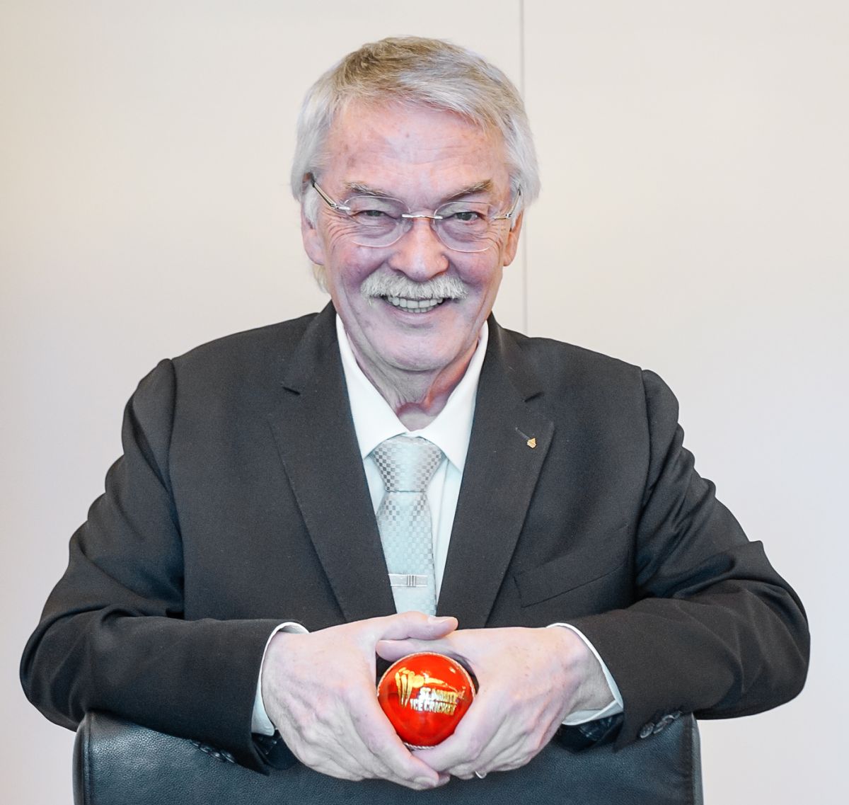 Hans Wiedemann (im Bild mit dem speziellen St. Moritzer Ice Cricket-Ball) ist Managing Director des Badrutt’s Palace Hotels St. Moritz und grosser Cricket-Fan. Das Fünf-Sterne-Haus ist Teamsponsor der «Badrutt’s Palace Diamonds» mit dem indischen Supersta