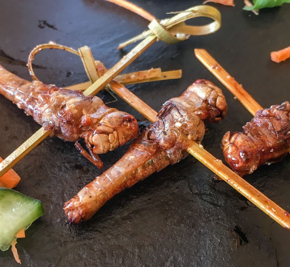 Die Europäische Wanderheuschrecke ist vorderhand eine von drei in der Schweiz für den menschlichen Verzehr zugelassene Insektenart. Hier in gegrillter Form als Apérospiess, gereicht mit Gemüsedekoration und Weisswein im Bergrestaurant La Motta auf Motta N
