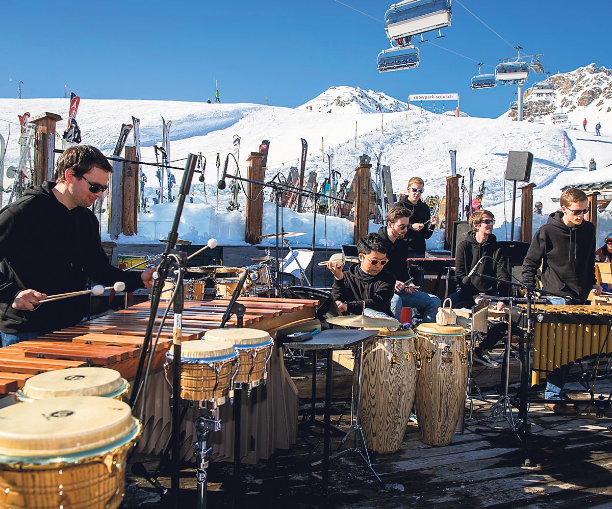 L’ensemble da percussiun Cosmic cun Janic Sarott da Scuol ha preschantà ritems da tuot il muond sülla Motta Naluns. (fotografia: Ensemble Cosmic)