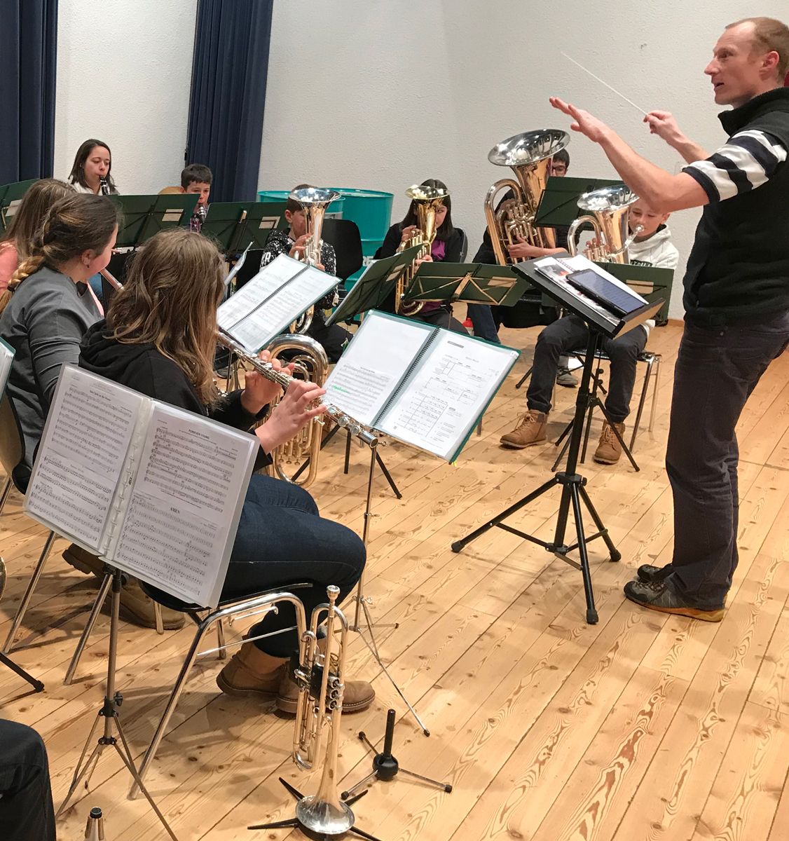 La Società musica da giuvenils La Plaiv-Zernez, cul dirigent Reto Lehner, s’allegra da pudair as preschantar ad ün vast public a Zernez (fotografia: mad).