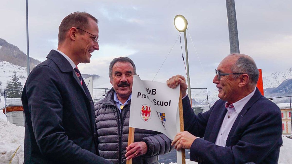 RhB-Direktor Renato Fasciati im Gespräch mit den beiden «Demonstranten für eine Bahnverbindung nach Mals», Mario Salis und Not Carl, am Bahnhof in Lavin (von links). Foto: Jon Duschletta
