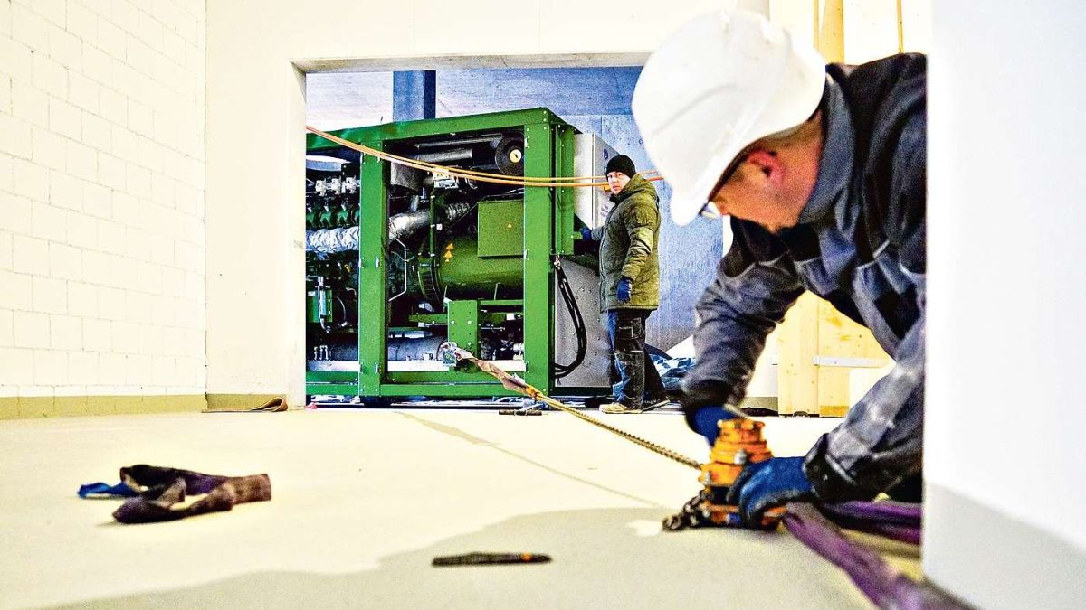 Es brauchte Muskelkraft und auch etwas Improvisationstalent, um das acht Tonnen schwere Blockheizkraftwerk in der ARA Oberengadin an seinen Standort zu bekommen. Foto: Jon Duschletta